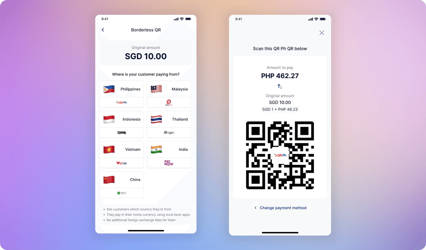 - Unified QR checkout — One dynamic QR code supports local and international payment methods in a single flow, reducing manual steps at checkout